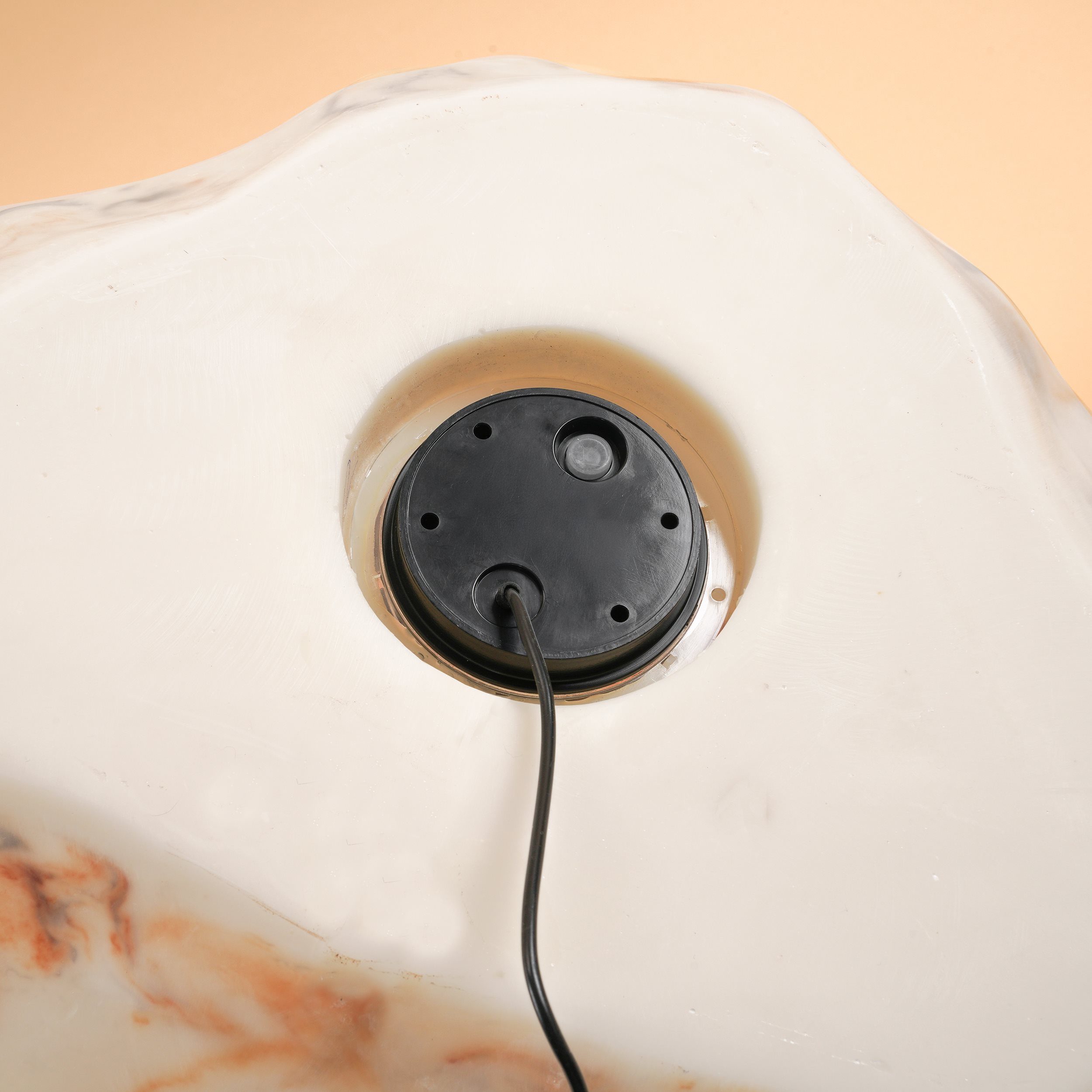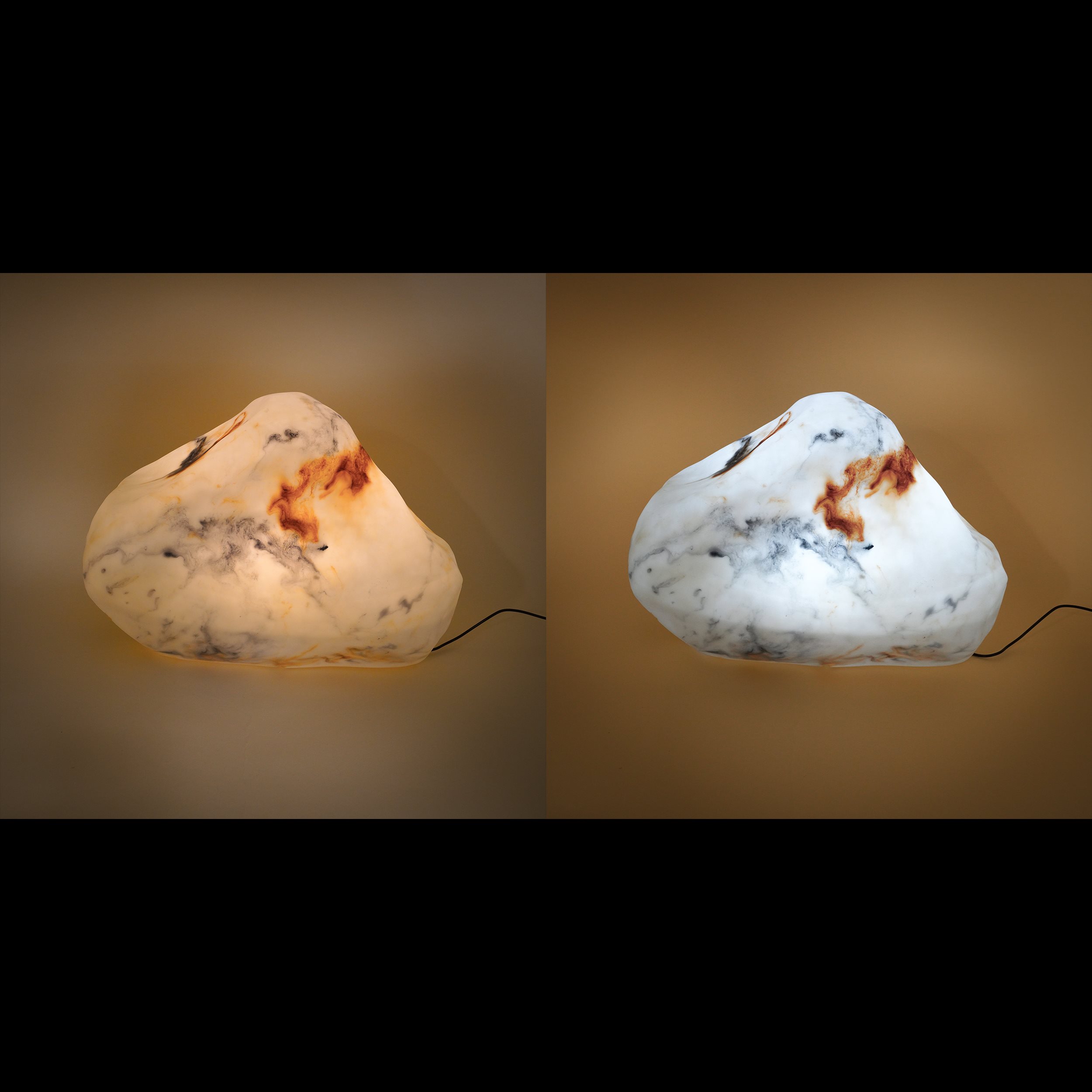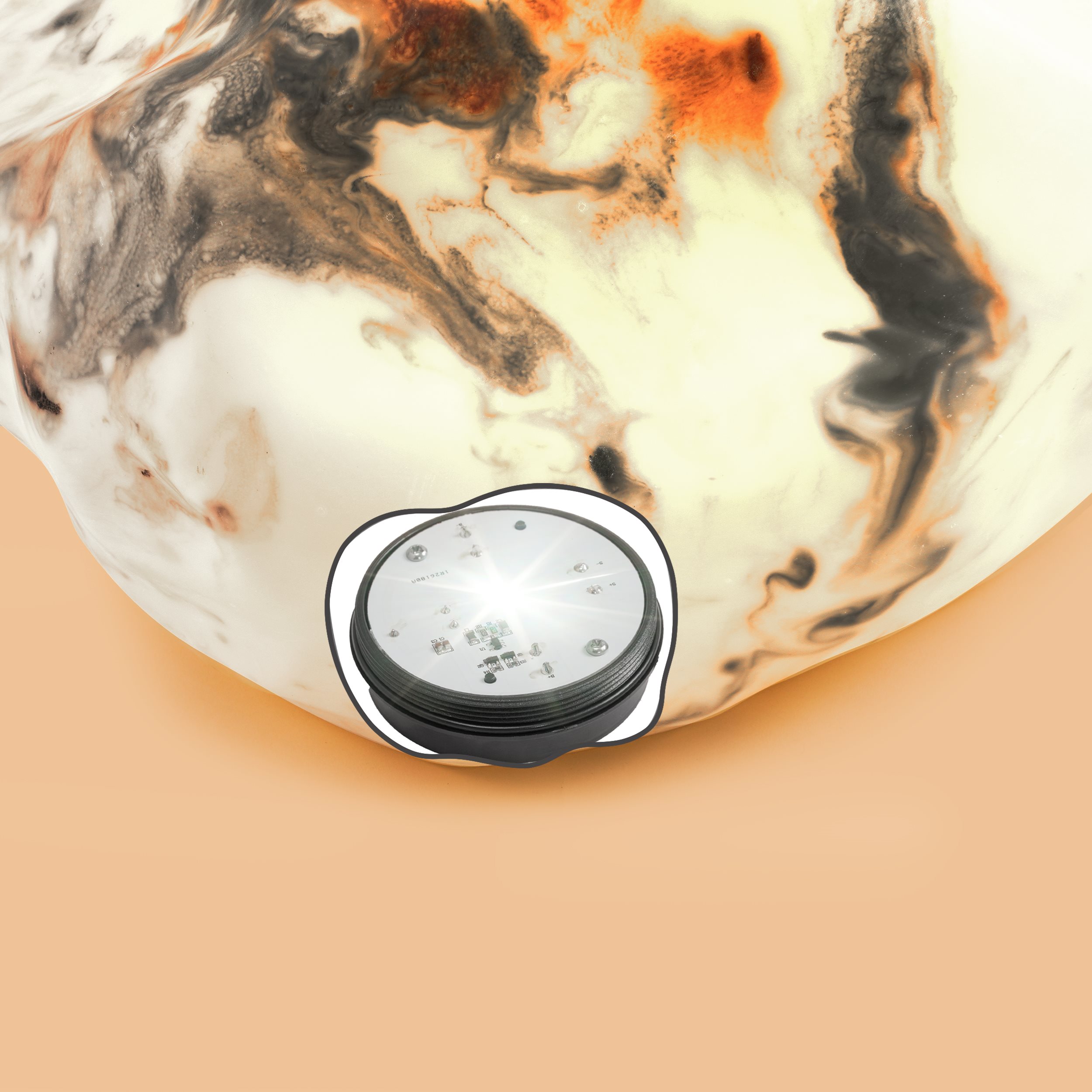| Produkt besteht aus: | Leuchtstein aus Kunstharz mit eingearbeiteten Farbverläufen (handgearbeitet) |