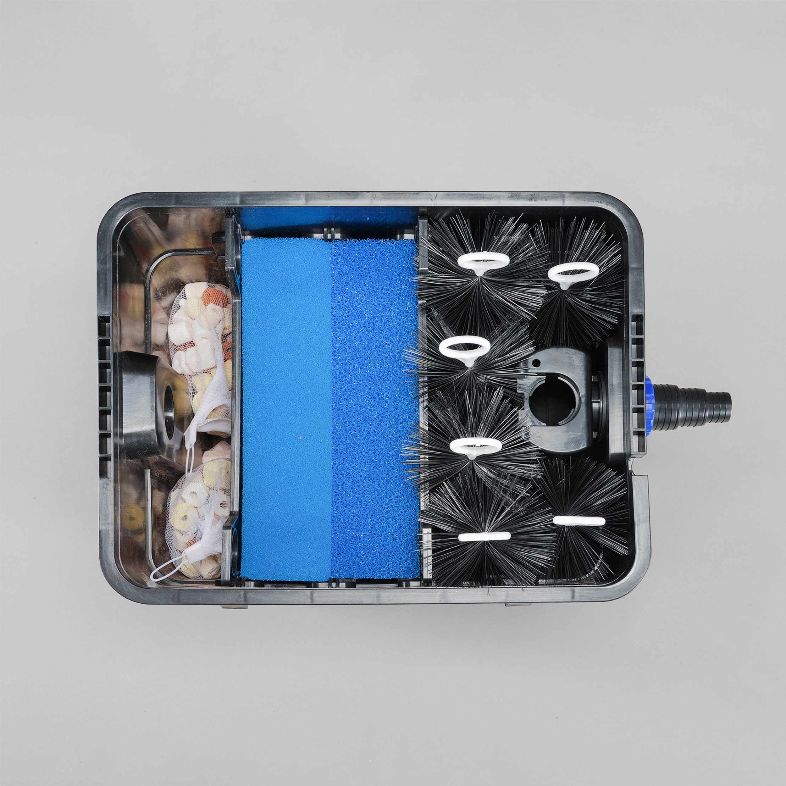 | Enthaltene Filtermedien: | Filterbürsten, grober und feiner Filterschwamm sowie Bio-Filtergranulat |