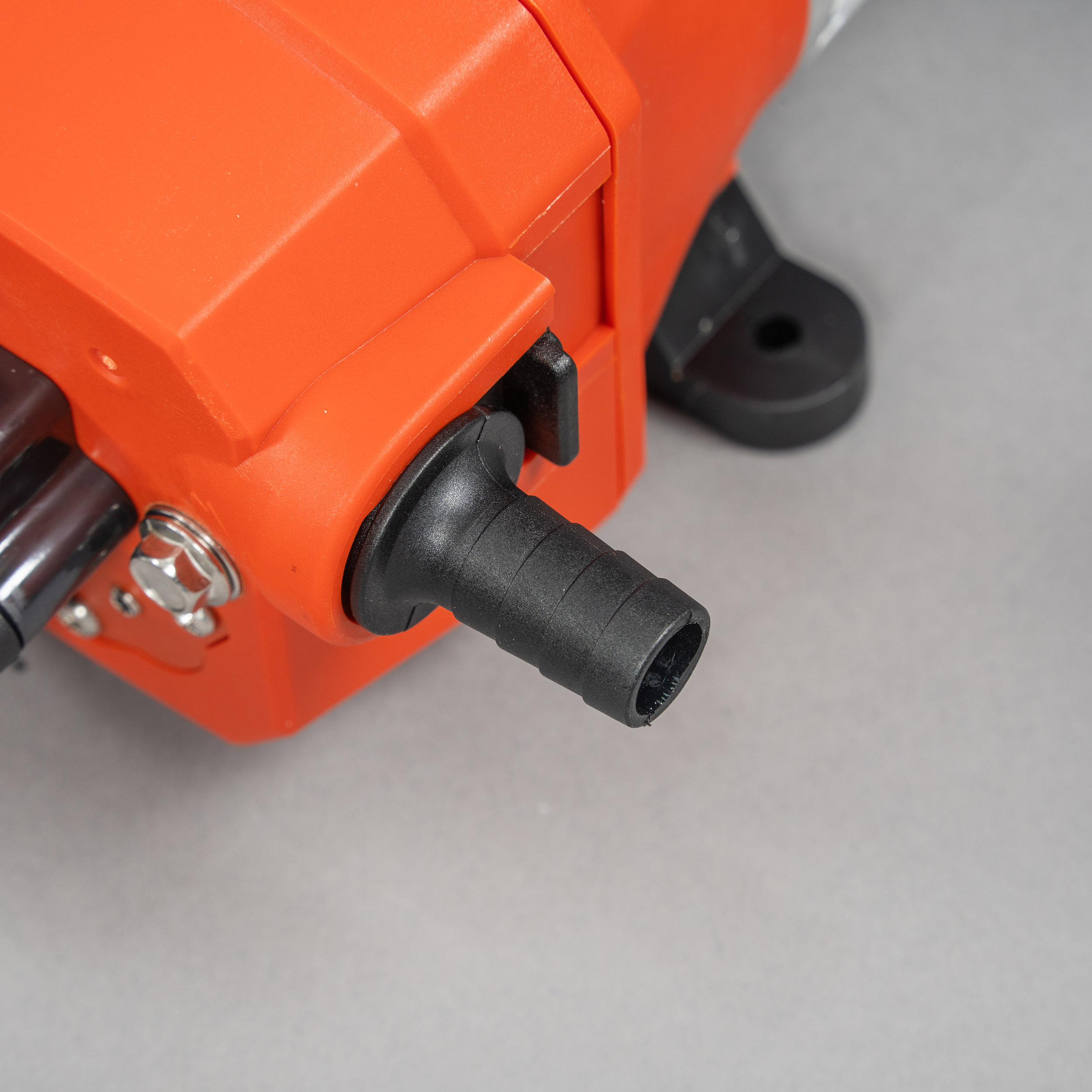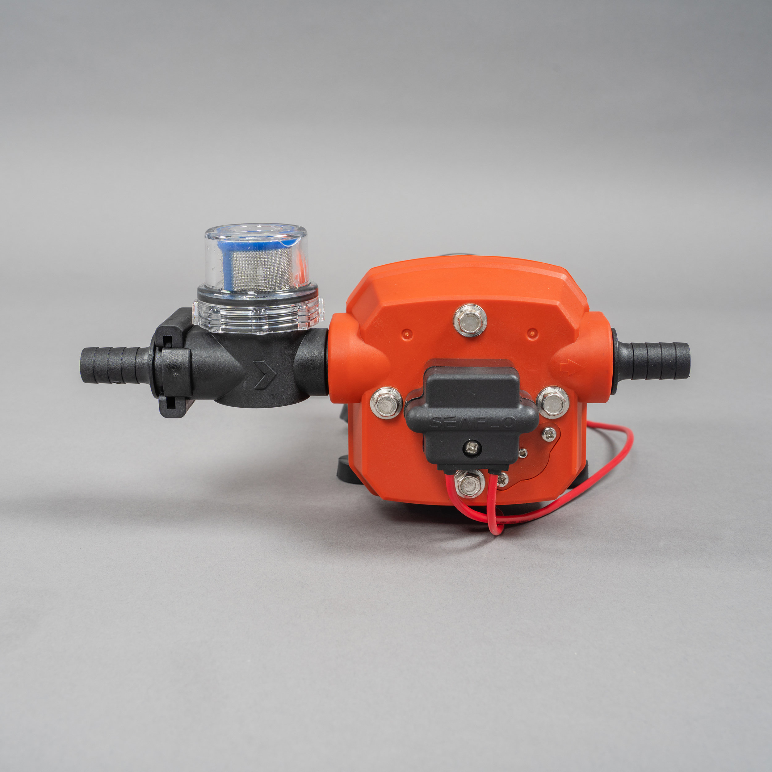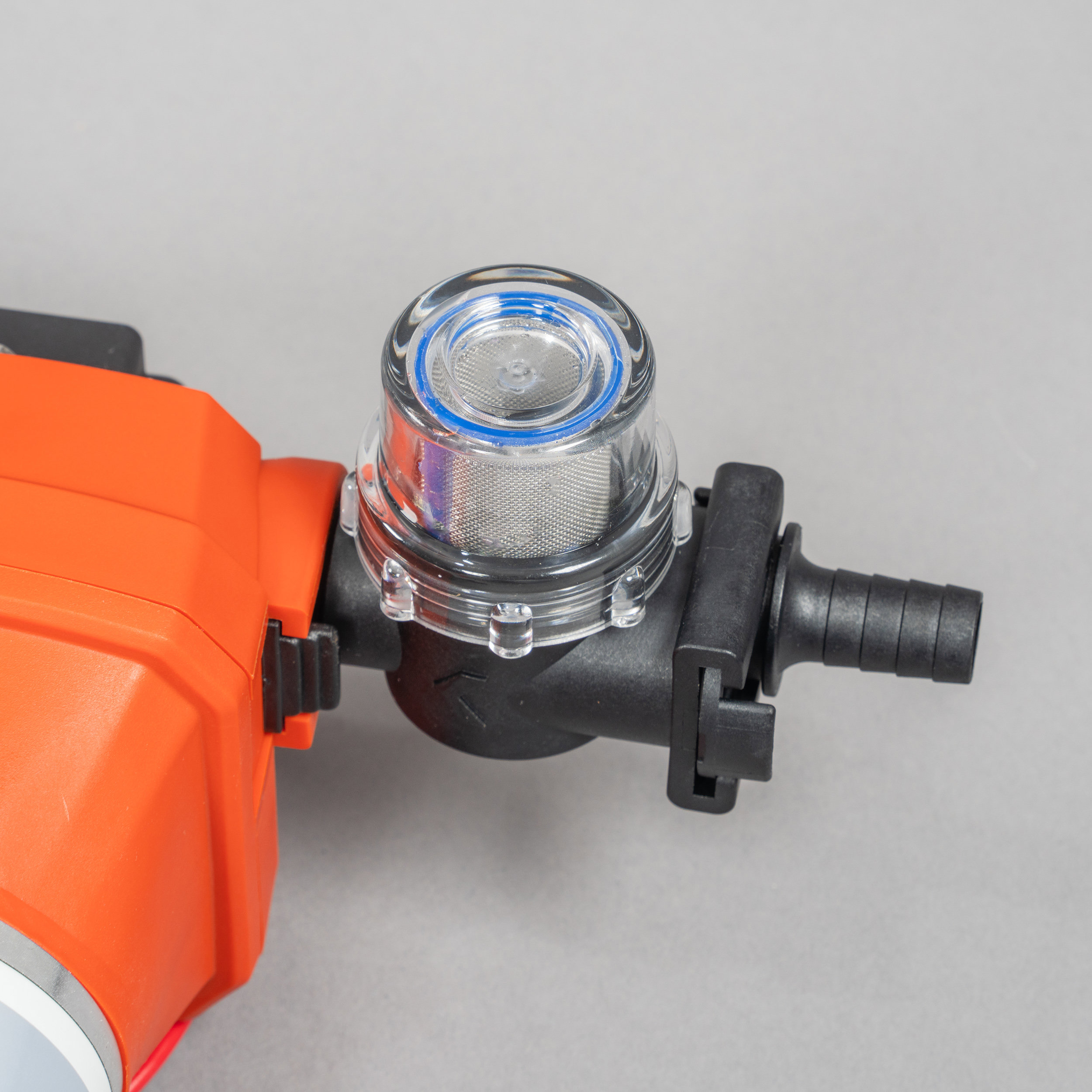 Zum Schutz der Membranpumpe wird im Ansaugbereich ein Wasserfilter über eine Schnellkupplung angeschlossen. Hier kann ein Saugschlauch über ein 1/2-Zoll-Außengewinde angeschlossen werden. Dieser verhindert, dass die Pumpe durch grobe Verunreinigungen beschädigt wird oder an Leistung verliert.