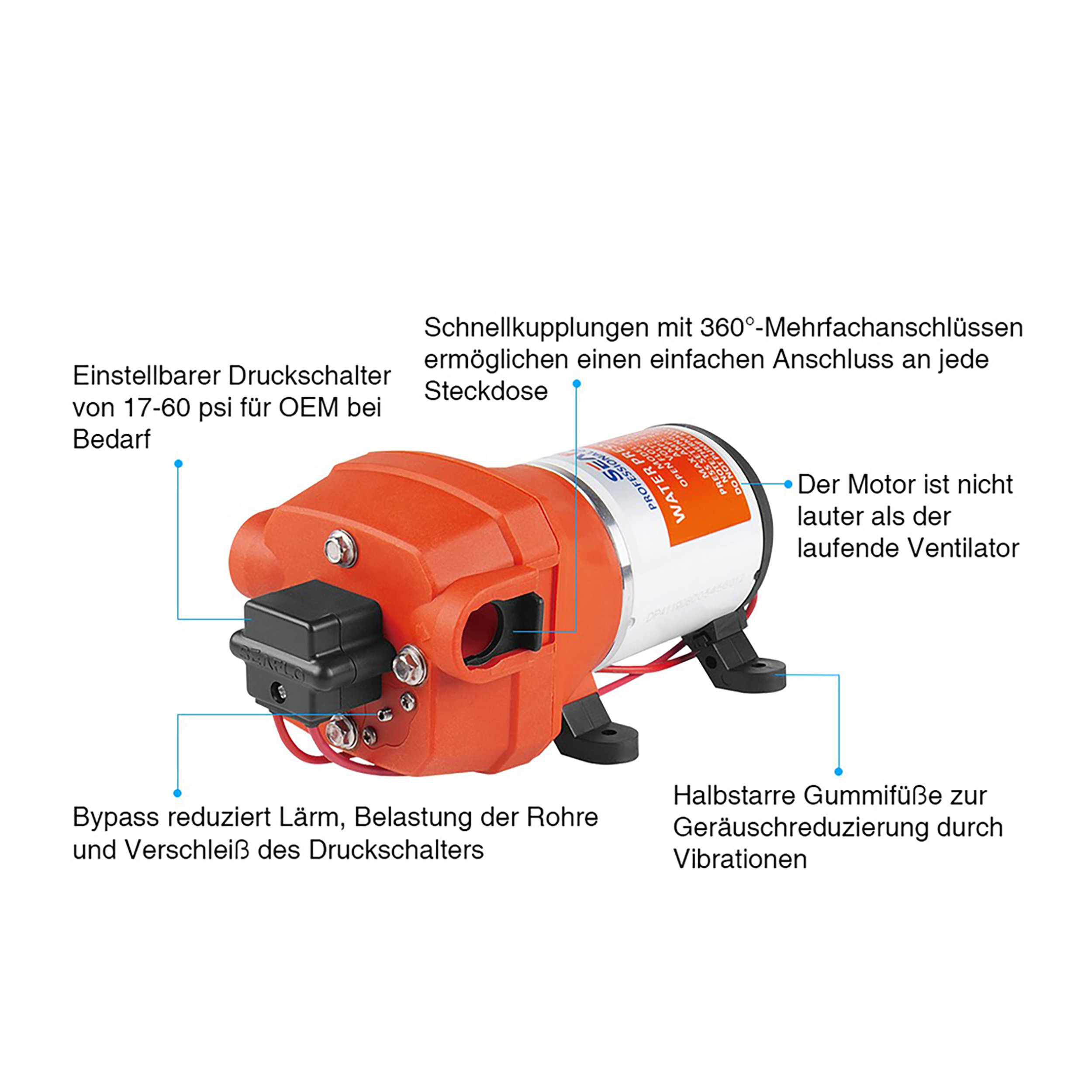 An der Druckseite kann ein Gartenschlauch mit einer Gartenspritze verbunden werden. Durch den eingebauten Druckschalter wird die Pumpe beim Verschließen der Spritze abgeschaltet. Die Membranpumpe ist eine äußerst robuste 4-Kammer-Membranpumpe. Der Kollektor-Gleichstrommotor überzeugt durch seine Durchzugskraft und Langlebigkeit. Der Anschluss des Wasserschlauchs erfolgt über die beiliegenden Schnellanschlussadapter. Im Lieferumfang ist je ein gerader und ein gewinkelter Anschluss enthalten.