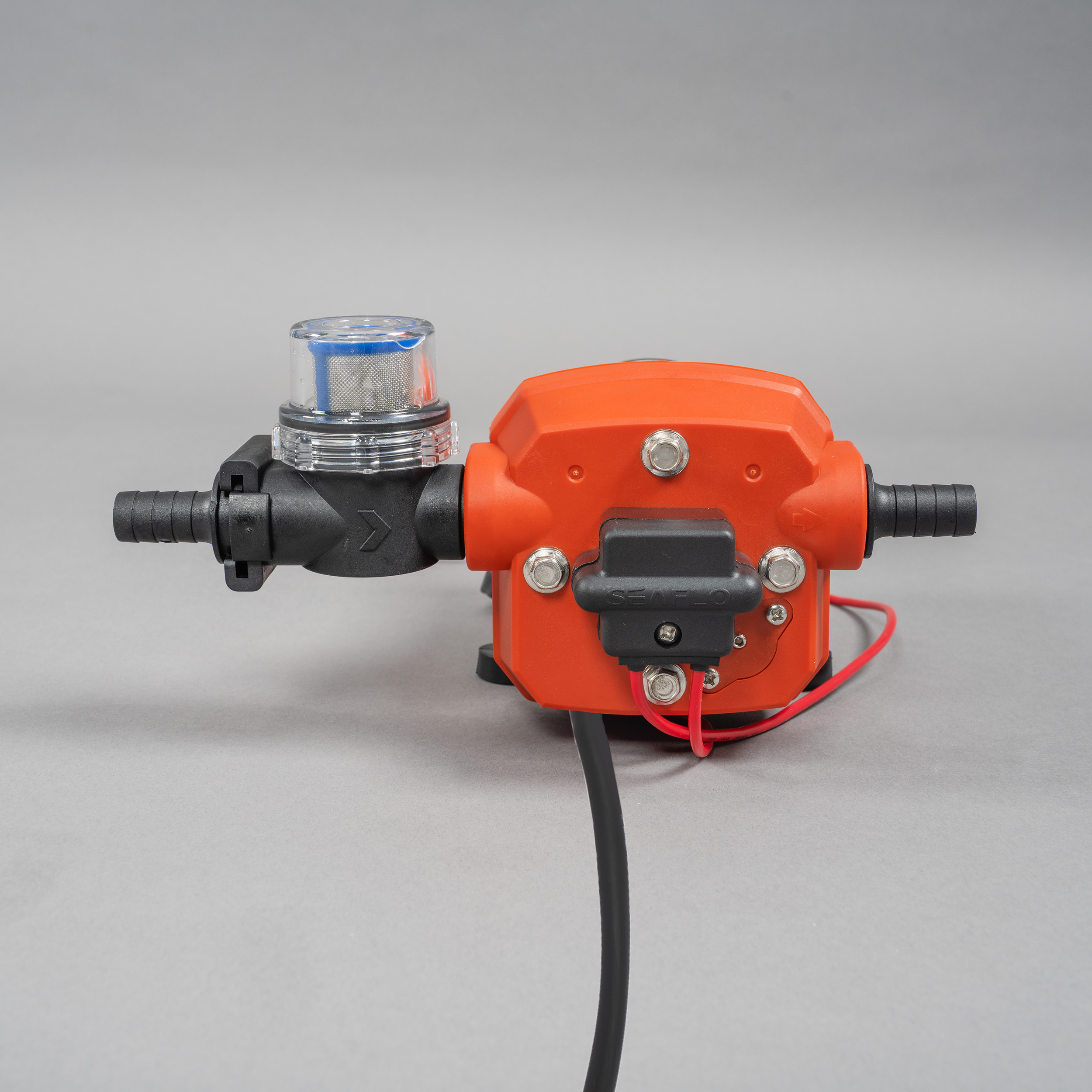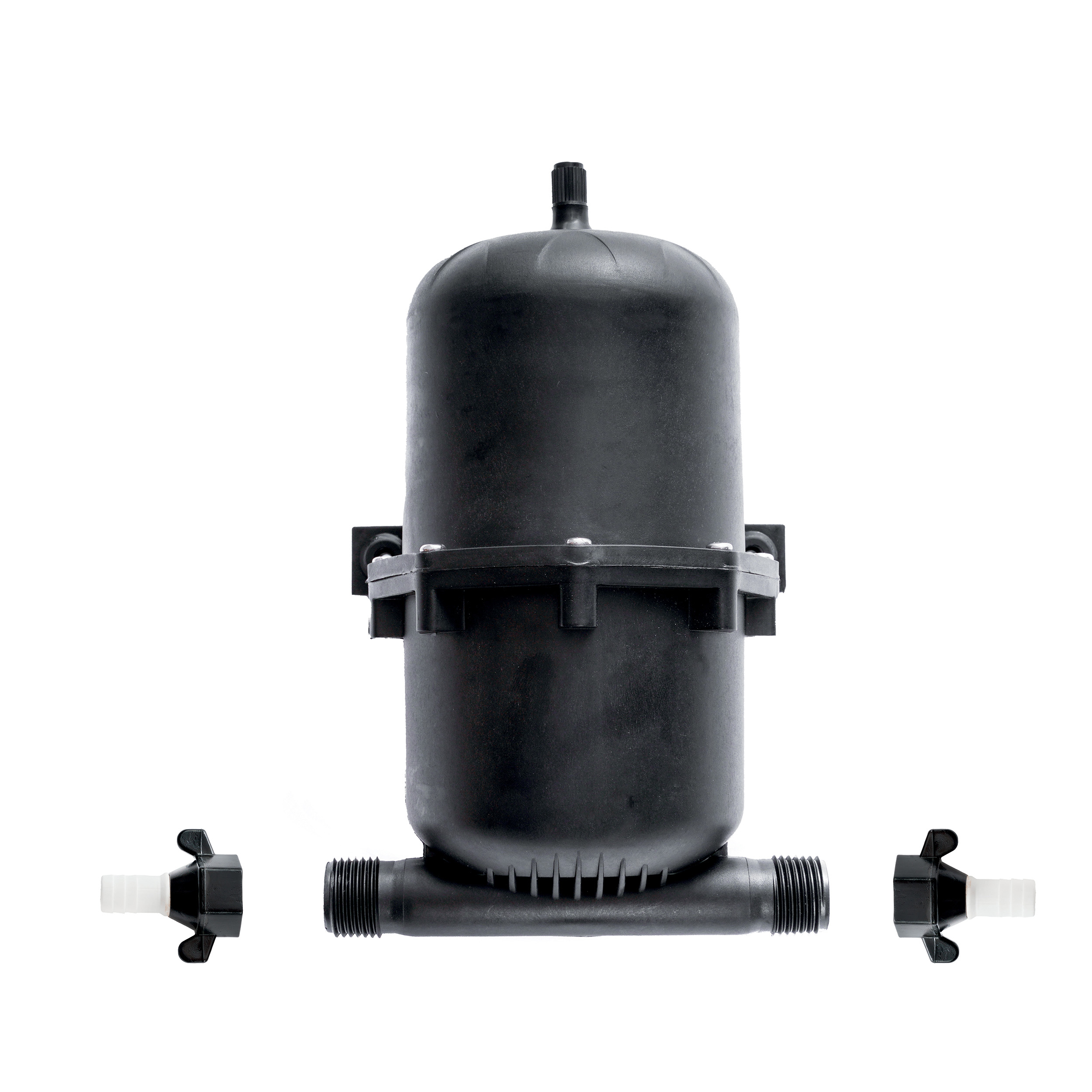 Der Ansaugbereich umfasst einen Wasserfilter.Zum Schutz der Membranpumpe wird im Ansaugbereich ein Wasserfilter über eine Schnellkupplung angeschlossen. Hier kann ein Saugschlauch über ein 1/2-Zoll-Außengewinde angeschlossen werden. Dieser verhindert, dass die Pumpe durch grobe Verunreinigungen beschädigt wird oder an Leistung verliert.