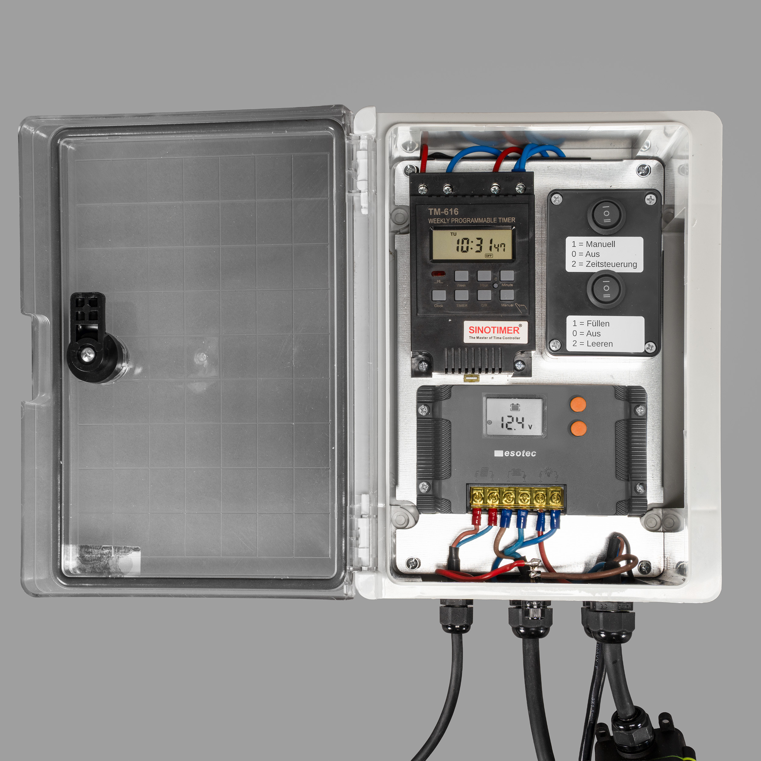 - 1 x Bewässerungscomputer EM-10 mit eingebautem Laderegler, Steuerung und Zeitschaltuhr