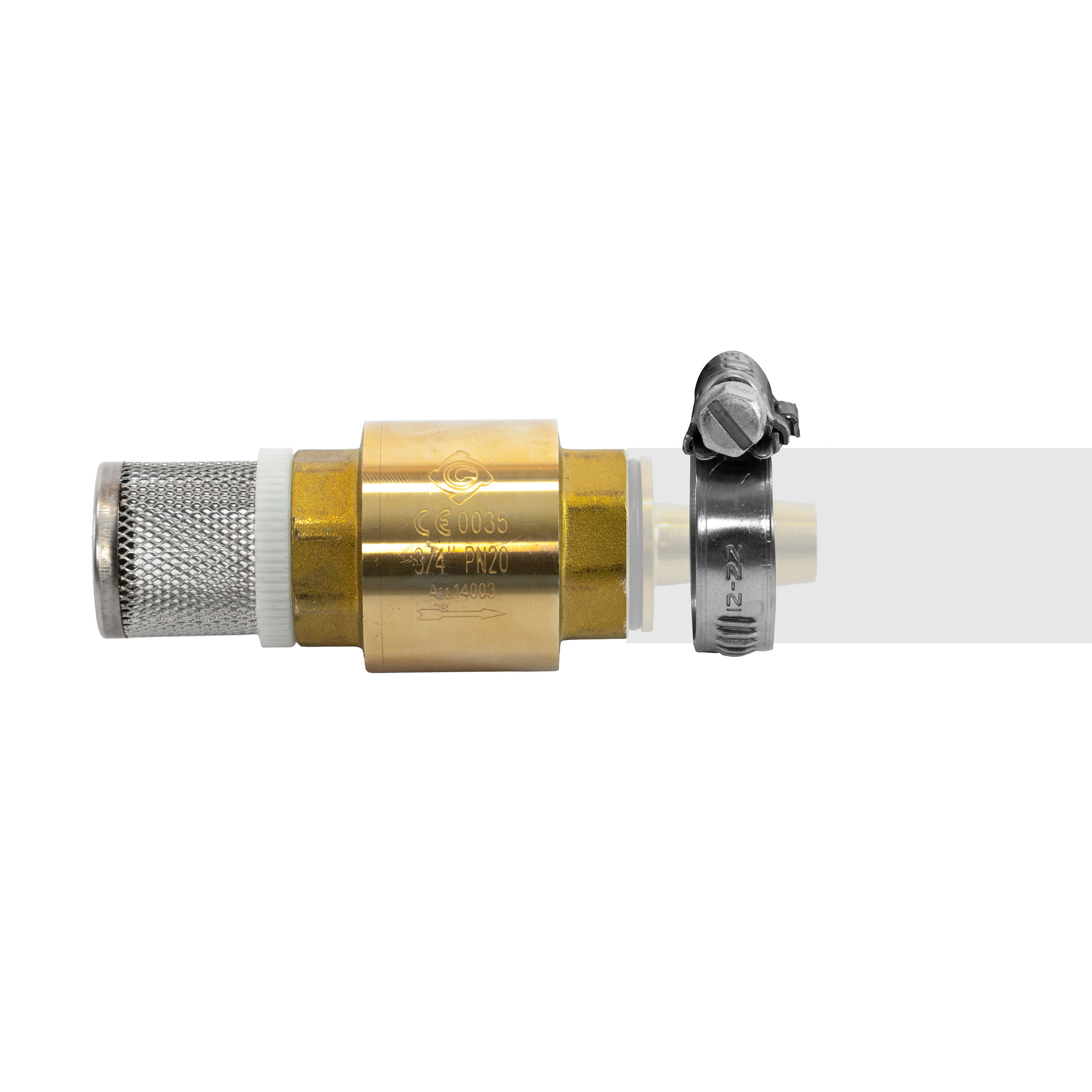 Massiver Messing Ansaugfilter mit Rückschlagventil und Schlauchschelle.