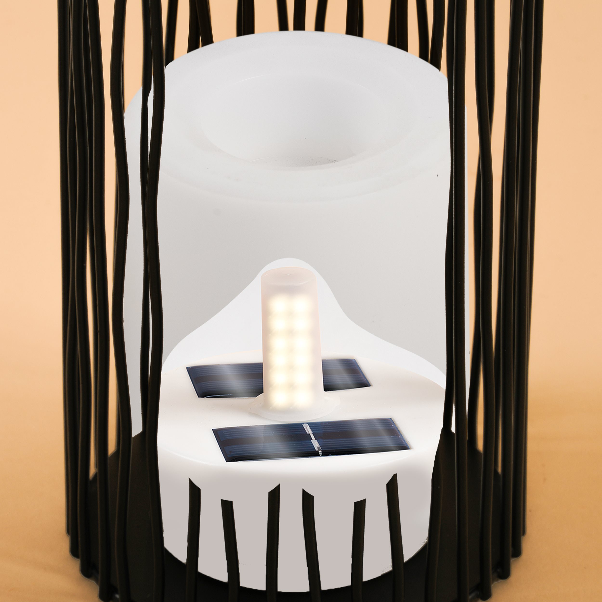 Im Inneren der Leuchtkerze sind das Solarmodul, samt Elektronik und Akku nahezu unsichtbar integriert. So vermutet man beim ersten Anblick gar keine Solarkerze, sondern sieht darin eher eine dekorative Wachskerze.