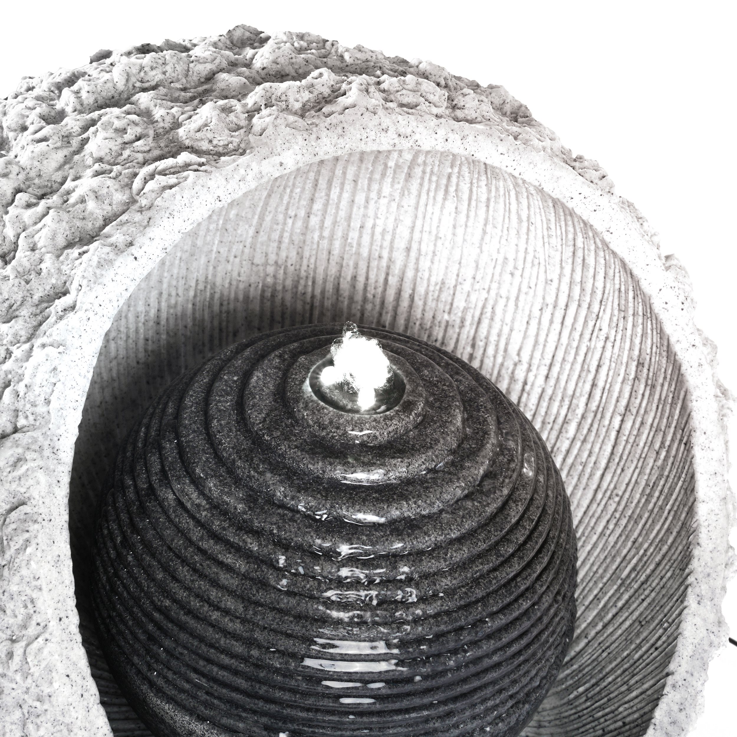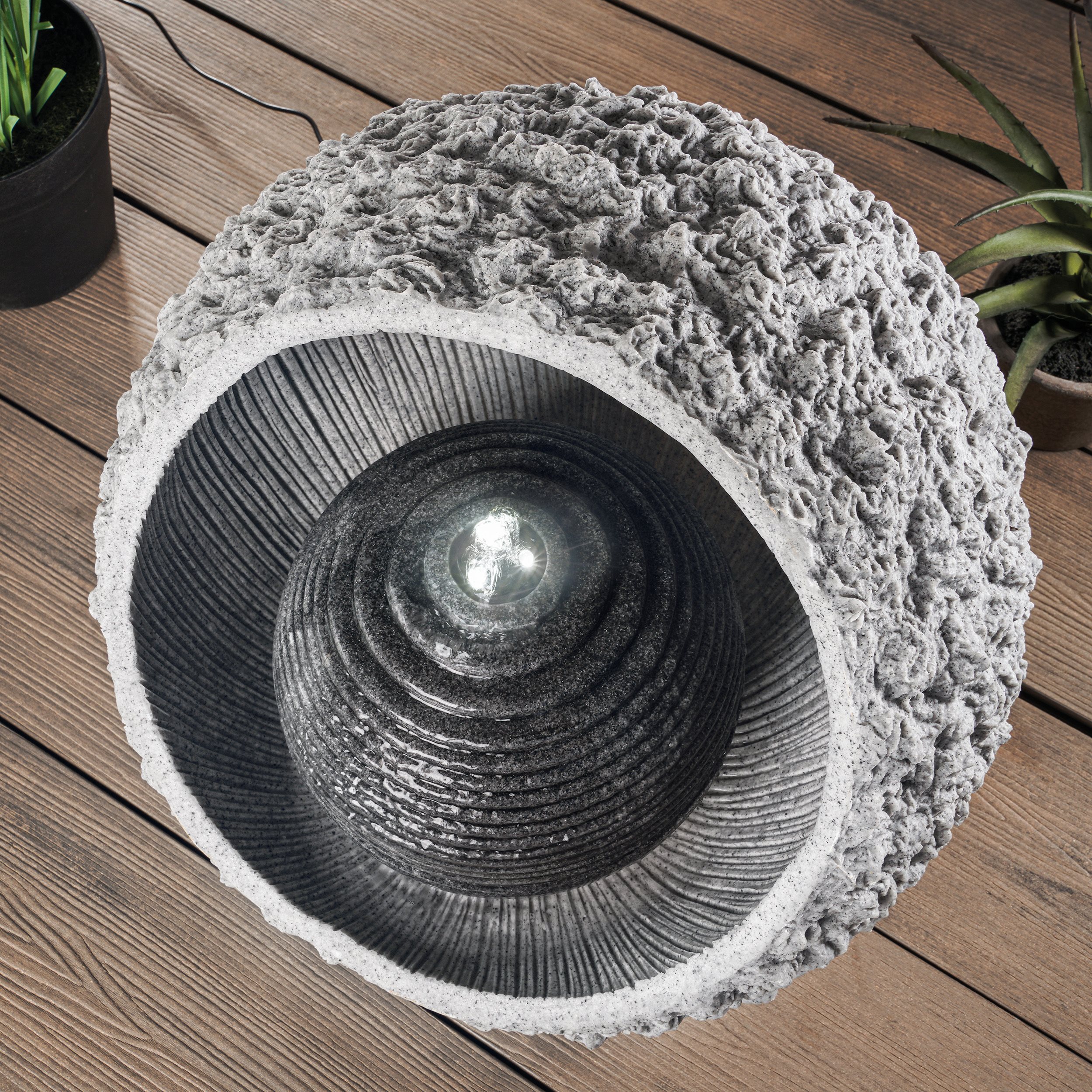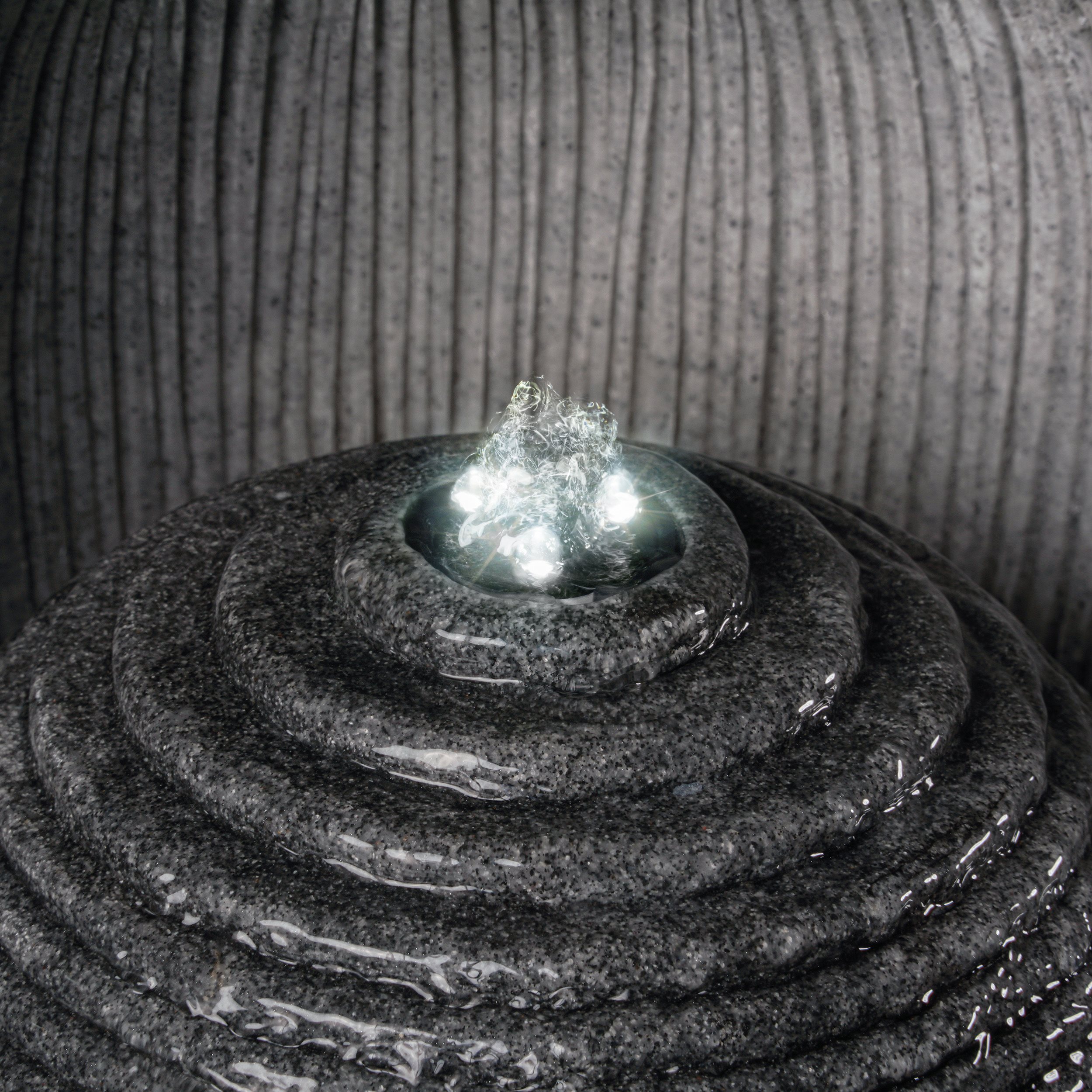 LED-BeleuchtungIm Lieferumfang enthalten ist ein eleganter LED-Lichtring mit Schlauchanschluss und drei warmweißen LEDs. Dieser sorgt für eine stimmungsvolle Beleuchtung Ihres Wasserbrunnens und schafft eine angenehme Atmosphäre in Ihrem Garten oder auf Ihrer Terrasse.