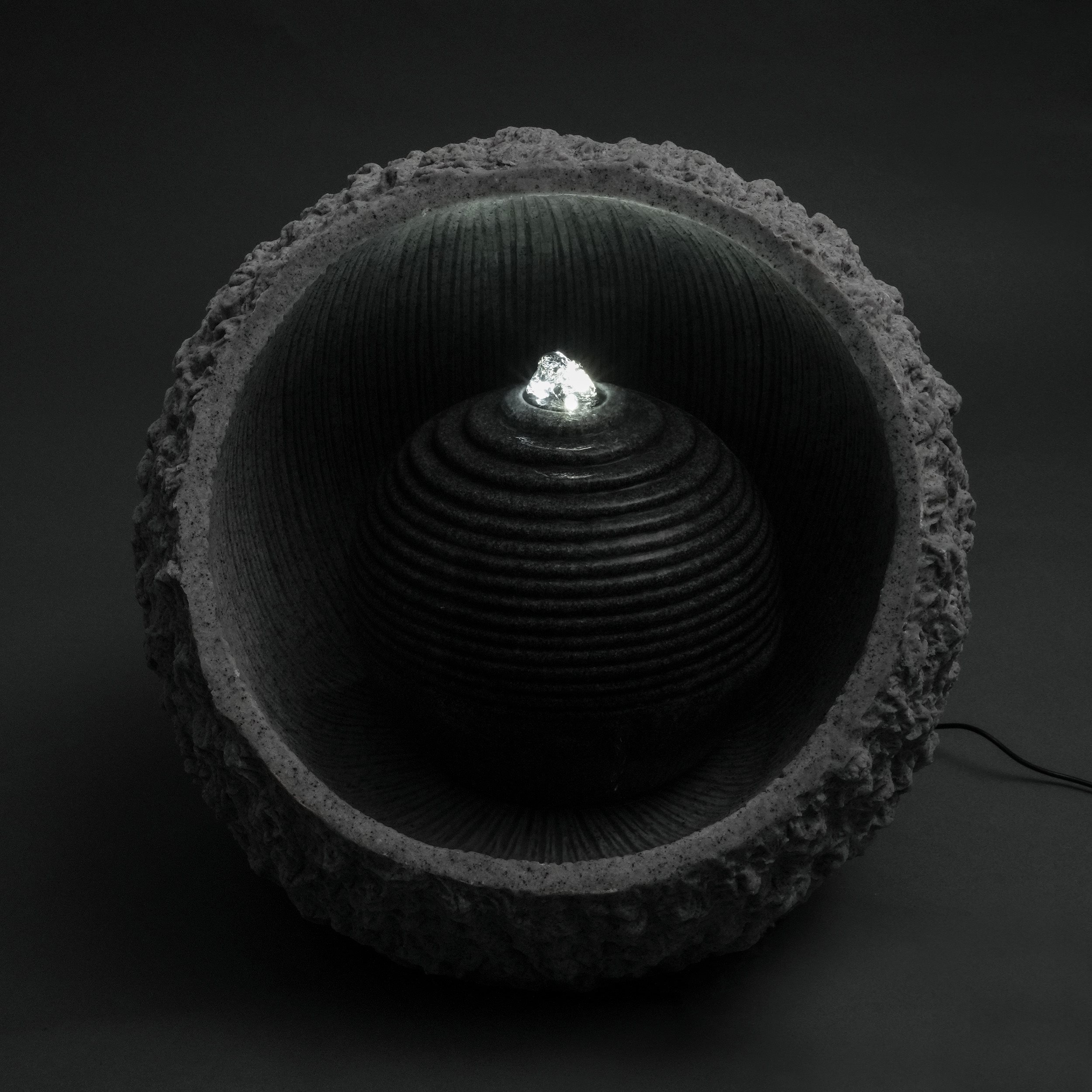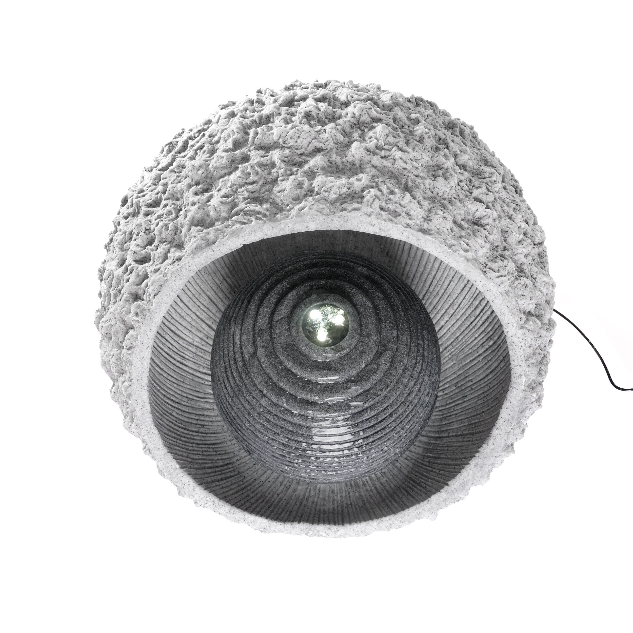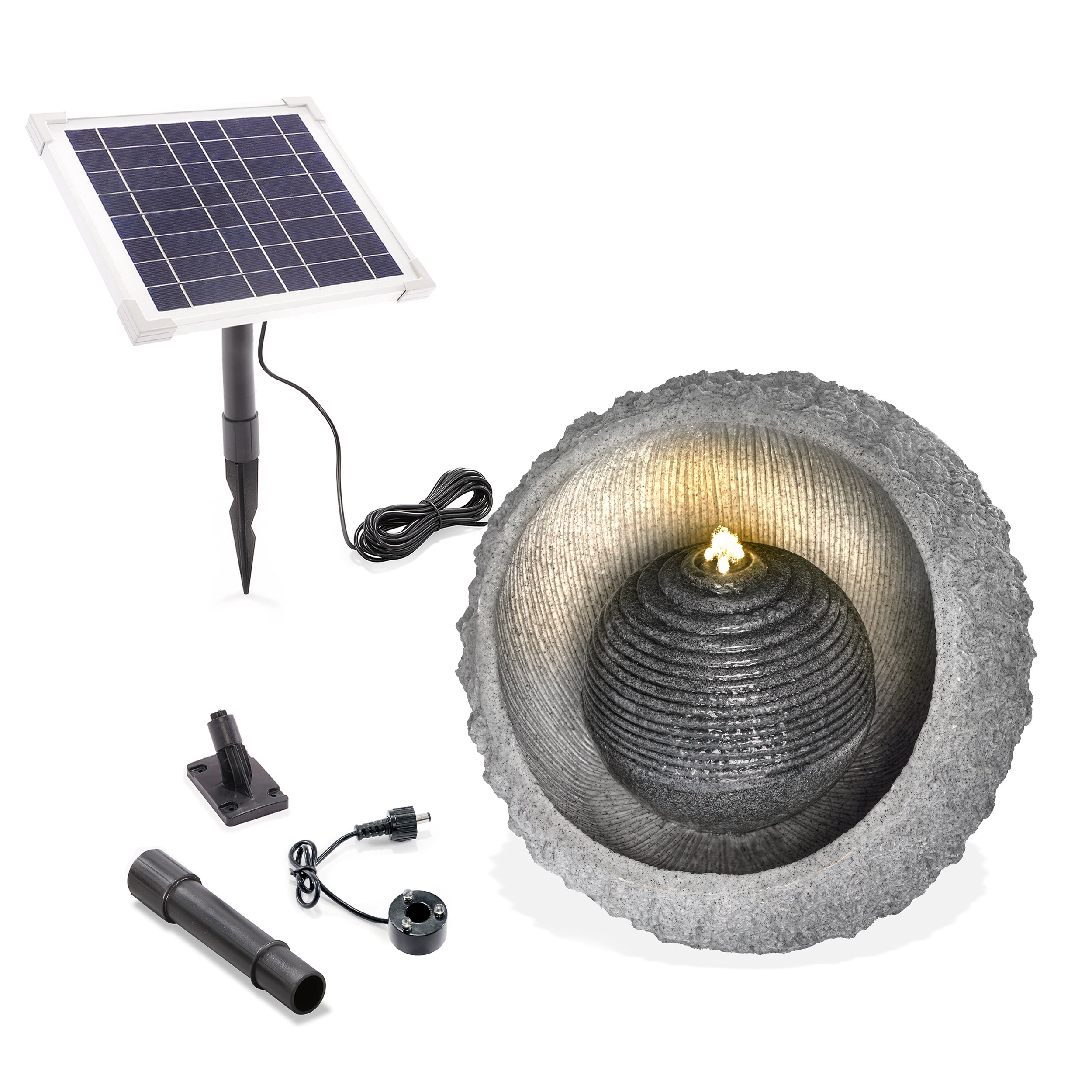 LED-BeleuchtungIm Lieferumfang enthalten ist ein eleganter LED-Lichtring mit Schlauchanschluss und drei warmweißen LEDs. Dieser sorgt für eine stimmungsvolle Beleuchtung Ihres Wasserbrunnens und schafft eine angenehme Atmosphäre in Ihrem Garten oder auf Ihrer Terrasse.