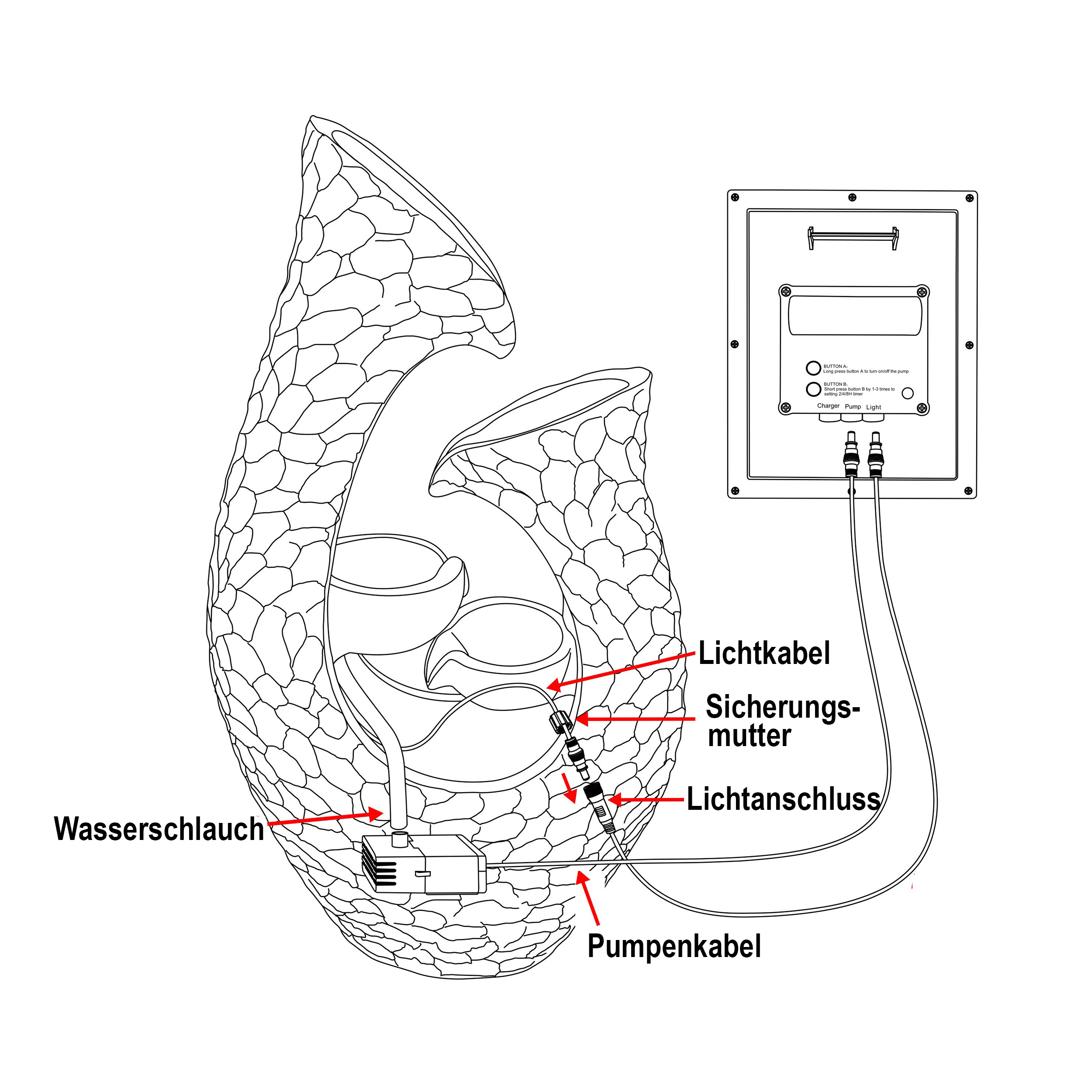 Das Solarmodul lässt sich vielseitig installieren. Sie können es mit dem im Lieferumfang enthaltenen Erdspieß direkt in den Boden stecken oder mithilfe der praktischen Wandhalterung an einer Wand befestigen. Optional können Sie einen LED-Lichtring anschließen, der bei Dunkelheit automatisch aktiviert wird. Er ist perfekt für eine stimmungsvolle Beleuchtung oder nächtliche Wasseranimationen.