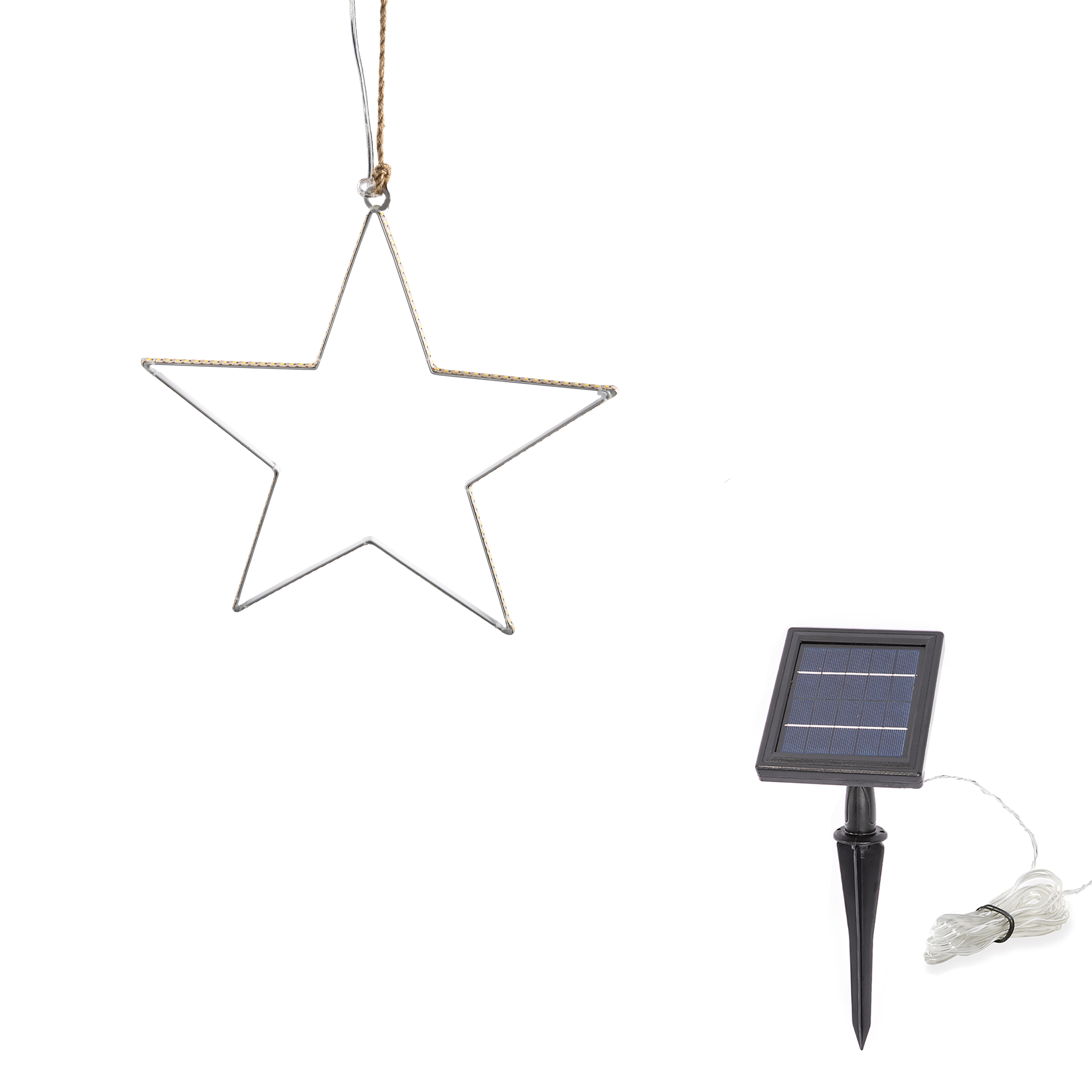 Der Solar-LED-Leuchtstern sorgt mit seinen warmweiß leuchtenden LEDs für eine stimmungsvolle und weihnachtliche Wohlfühlatmosphäre. Sein stabiles Metallgestell ist weiß beschichtet. Somit ist die Leuchte nicht nur bei Nacht, sondern auch am Tag ein echter Blickfang. Ein weißes Metallgestell sorgt für Stabilität, während 134 LEDs für eine optimale Lichtverteilung sorgen Der Grundkörper des Sterns besteht aus weiß beschichtetem, gebogenem Flachmetall, auf dem ein LED-Lichtband aufgeklebt ist. Die 134 einzelnen SMD-LEDs sind im Abstand von ca. 8 mm hintereinander auf einer Trägerfolie aufgelötet und strahlen in einem harmonischen Licht um den Stern. Das LED-Lichtband ist wetterfest vergossen und trotzt somit allen Witterungsbedingungen. Das transparente Kabel fügt sich harmonisch zwischen Stern und Solarmodul ein. Der Stern kann über eine Öse aufgehängt werden. Leistungsstarkes, polykristallines Solarmodul In dem Solarmodul an der Vorderseite finden handverlesene, leistungsstarke, polykristalline Solarzellen ihren Platz. Diese sind wetterfest hinter Glas eingebettet und sorgen auch bei Tageslicht oder schlechter Sonneneinstrahlung für bestmögliche Nachladung des Akkus und einen ungetrübten Einsatz in der Winterzeit. Das Solarmodul kann über einen Erdspieß in den Boden gesteckt oder über Schrauben an der Wand montiert werden. Über ein Gelenk kann das Solarmodul optimal zur Sonne ausgerichtet werden. Langlebiger Lithium-Akku Lithium-Akkus sind aktuell eine der effektivsten Möglichkeiten zur Speicherung von Solarenergie. Sie zeichnen sich insbesondere durch ihre hohe Zyklenfestigkeit und ihren hohen Ladewirkungsgrad aus. Bei richtiger Handhabung haben sie eine Lebensdauer von mehreren Jahren. Selbstverständlich kann der Akku am Ende seiner Lebensdauer durch einen Neuen ersetzt werden. |