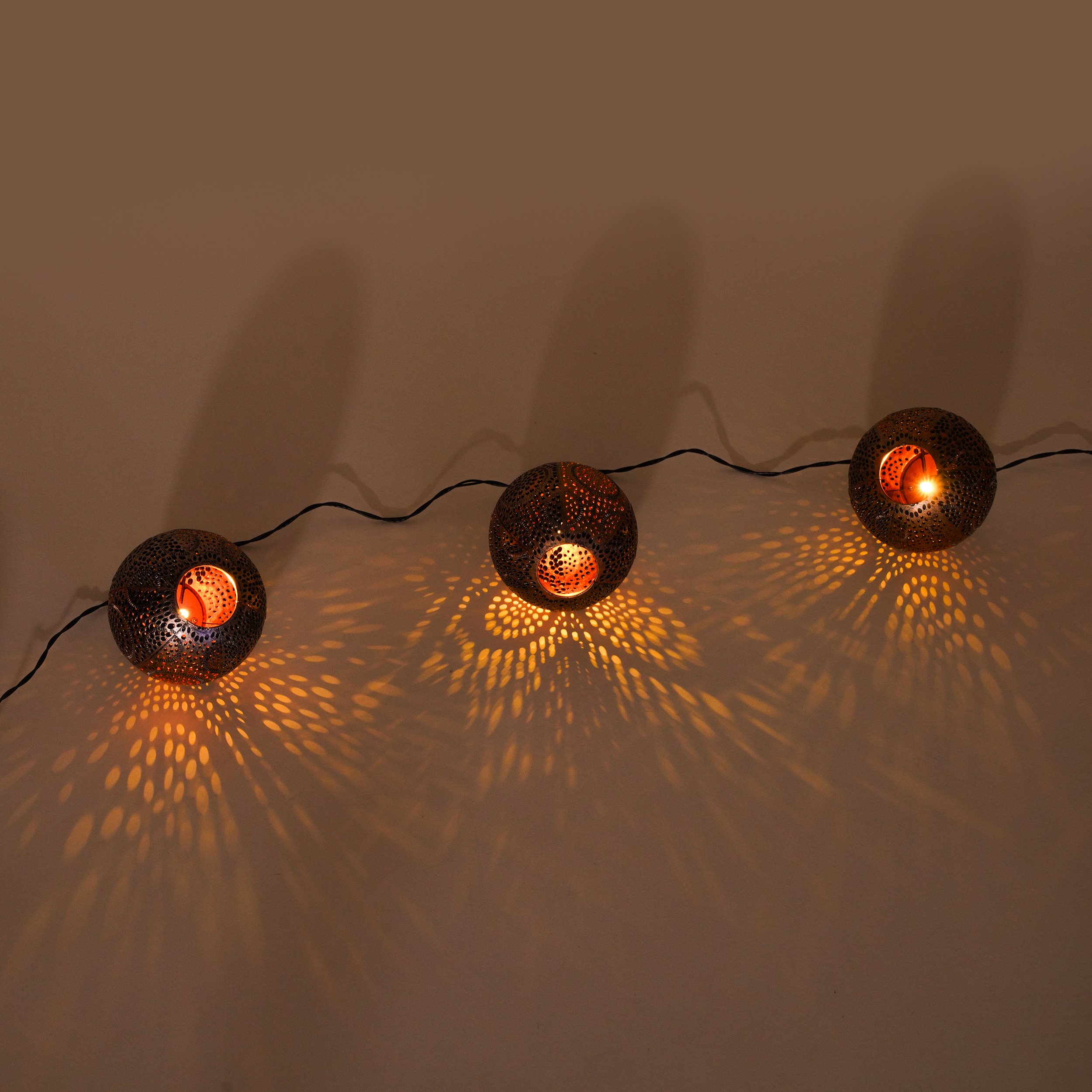 | Produkt besteht aus: | Lampenschirme/Kugeln aus Kunststoff (Außen altkupfer, Innen kupferfarben) |