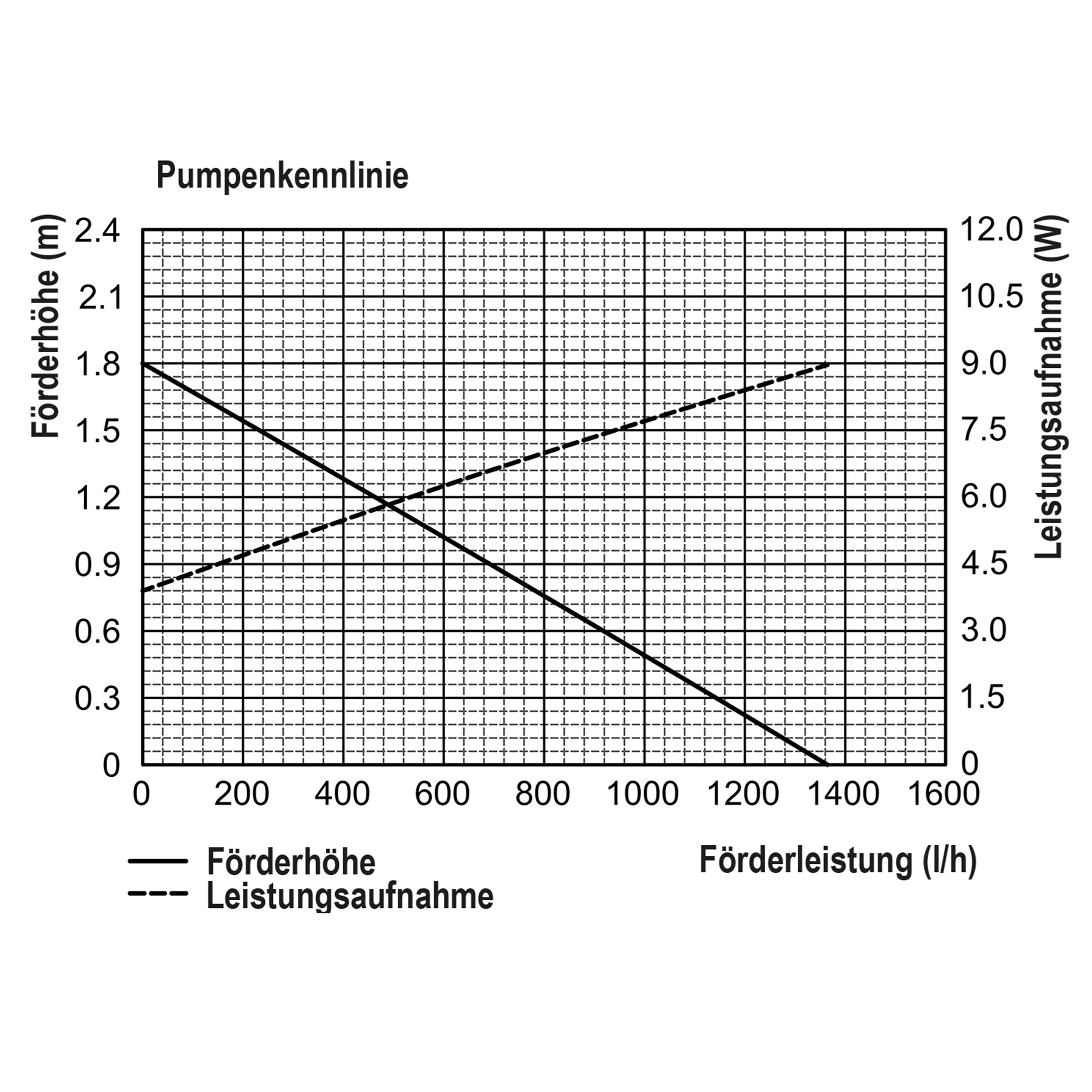 | Förderhöhe: | Max. 1,6 m bei 200 l/h (Kennlinie siehe Bilder) |