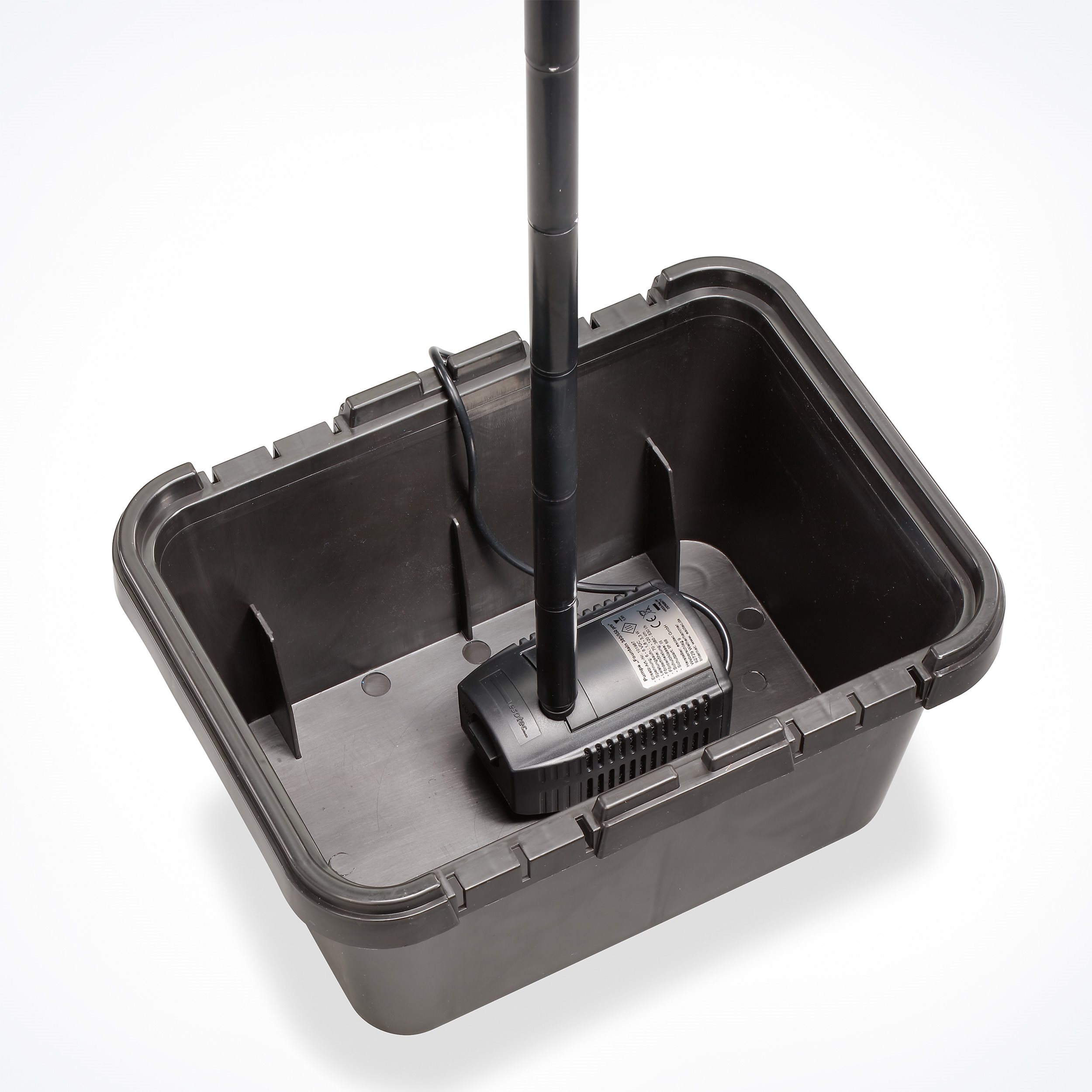 Die Pumpe ist im Innern der Filterbox eingesetzt. Damit das Wasser von oben in die Filterbox einströmen kann, muss diese komplett unter Wasser stehen.