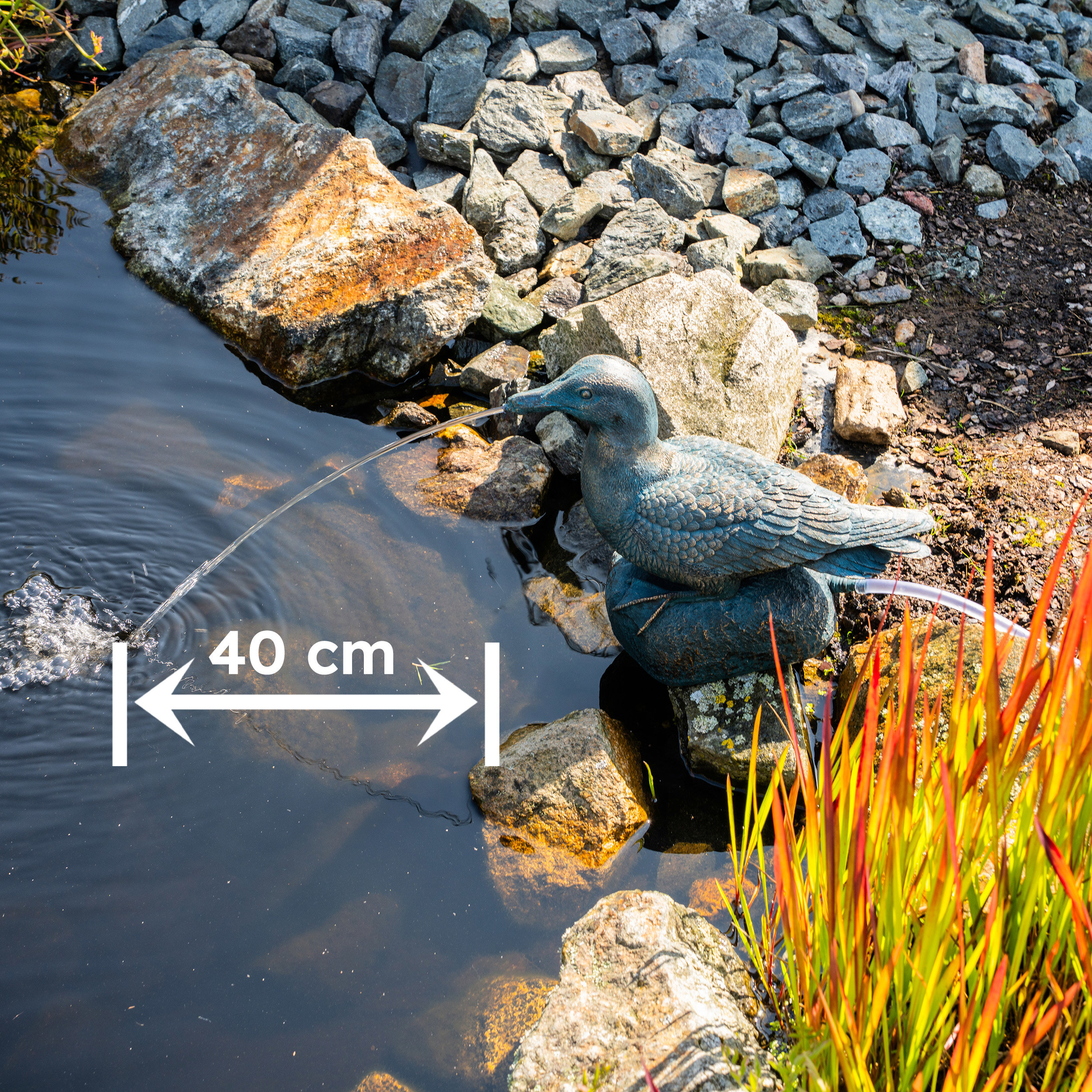Teichpumpe mit Steigrohr arbeitet gut, mit Schlauch (5 m) am Sprudelstein ist volle Sonne notwendig.