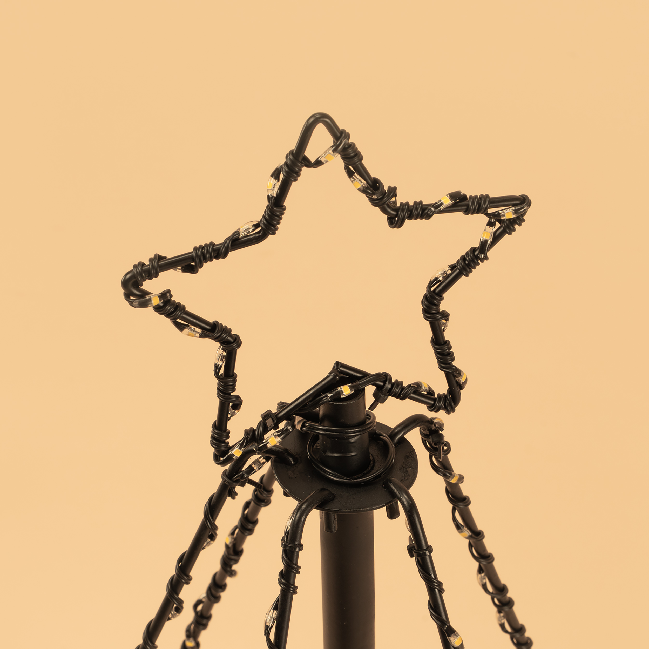 Metallgestell, um das eine feine Lichterkette mit schwarzem Kabel