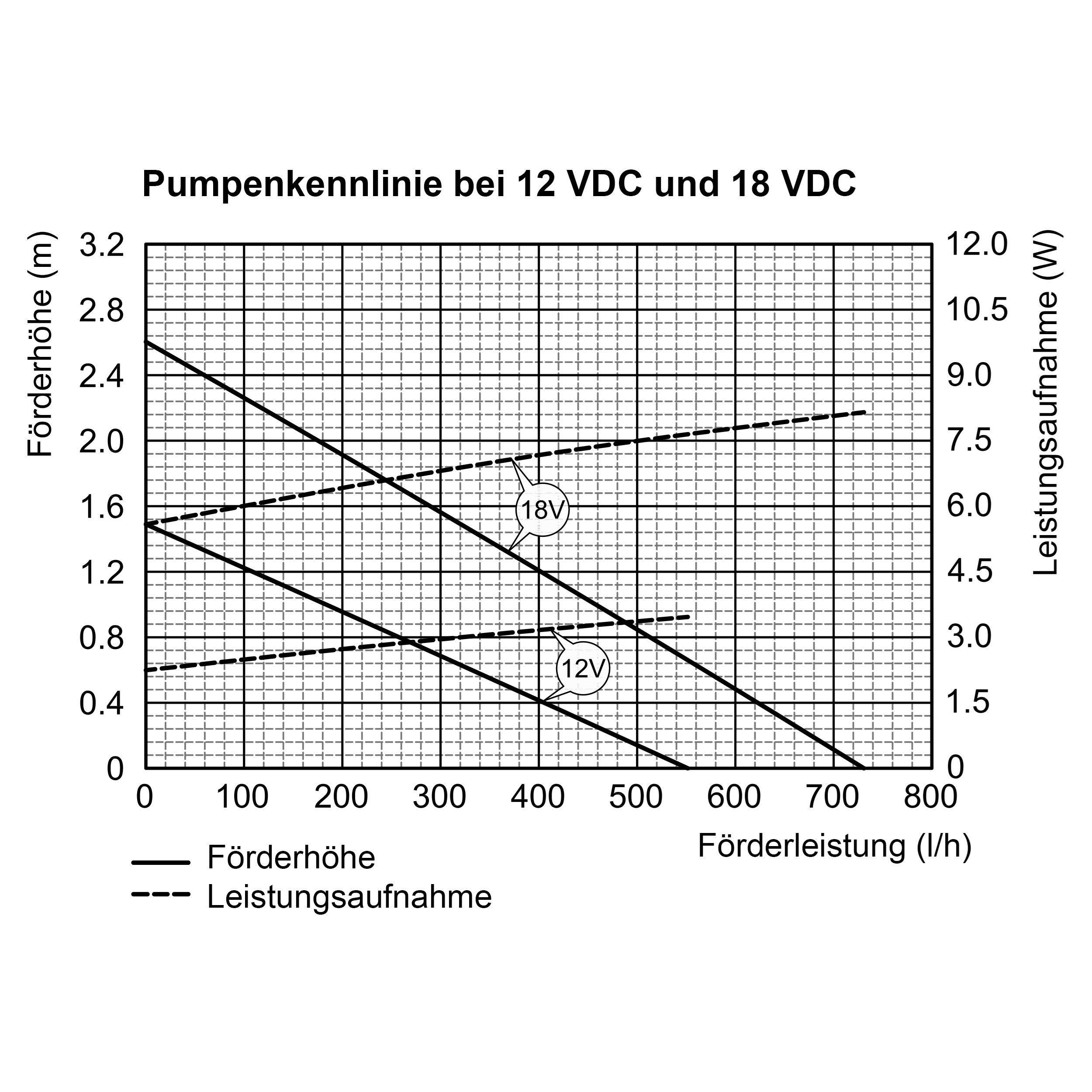 | Förderleistung: | 12 V: max. 500 l/h (Kennlinie siehe Bilder) |